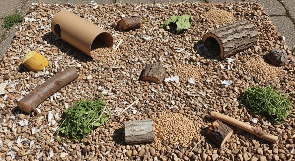 - Matières à ronger : Branche de noisetier (non traitée), pastilles de minéraux pour aider à l’usure des dents.