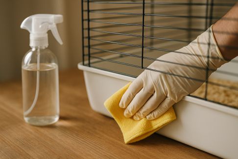 - Nettoyez la cage chaque semaine : retirez complètement la litière, désinfectez avec un produit adapté (sans phénol, toxique pour NAC) ou du vinaigre blanc dilué sous réserve de bien rincer.